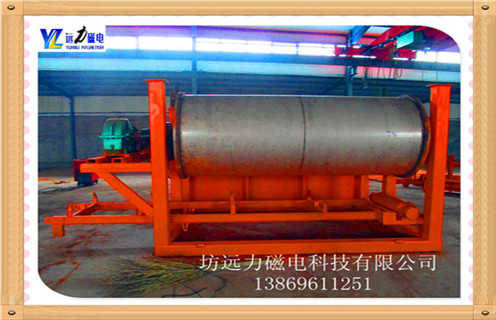 非磁性有色金屬材料在重力作用下落在磁性材料的外面.這些材料隨著筒體的旋轉(zhuǎn),非磁性材料在重力作用下從氣缸下落,在滑槽中.含鐵磁性材料吸附在圓筒的表面上并繼續(xù)旋轉(zhuǎn),直到其不具有磁力.材料從帶式輸送機排出,并最終分成含鐵材料和無鐵材料.
